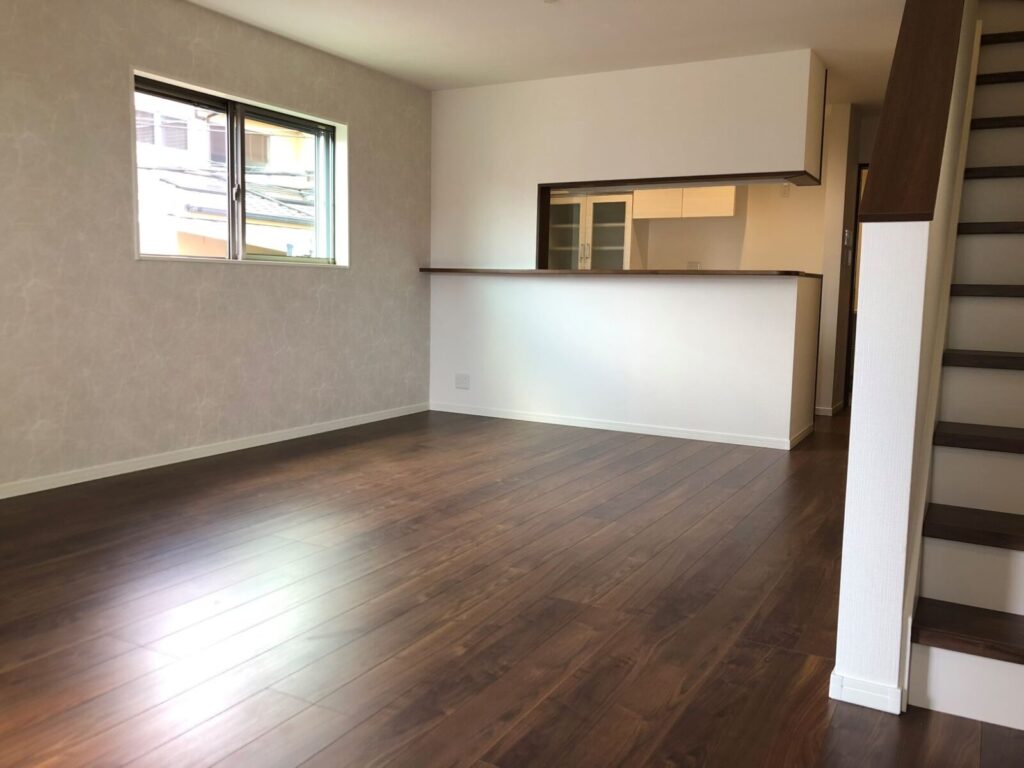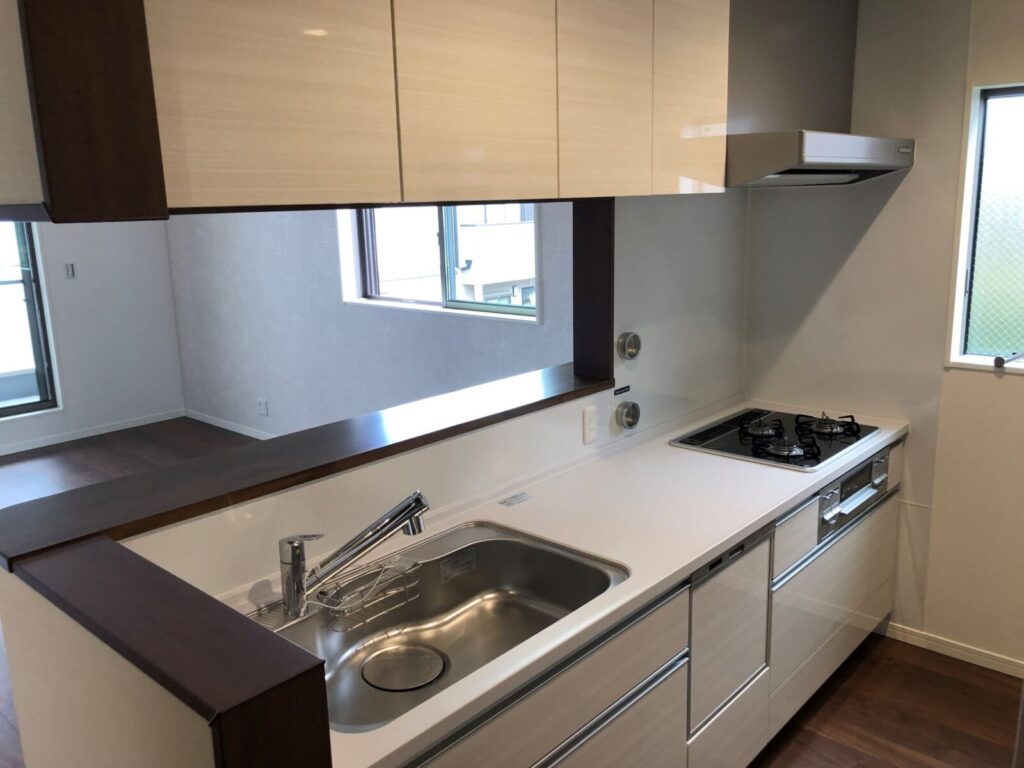2階のLDKには対面キッチン、大型パントリー、お子様のスタディコーナーが配置され、家族が自然にリビングに集まるように設計されています。